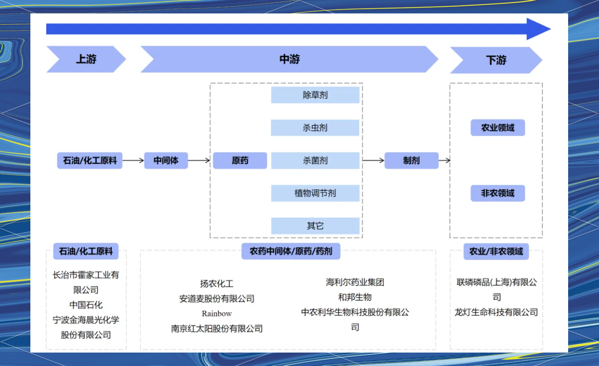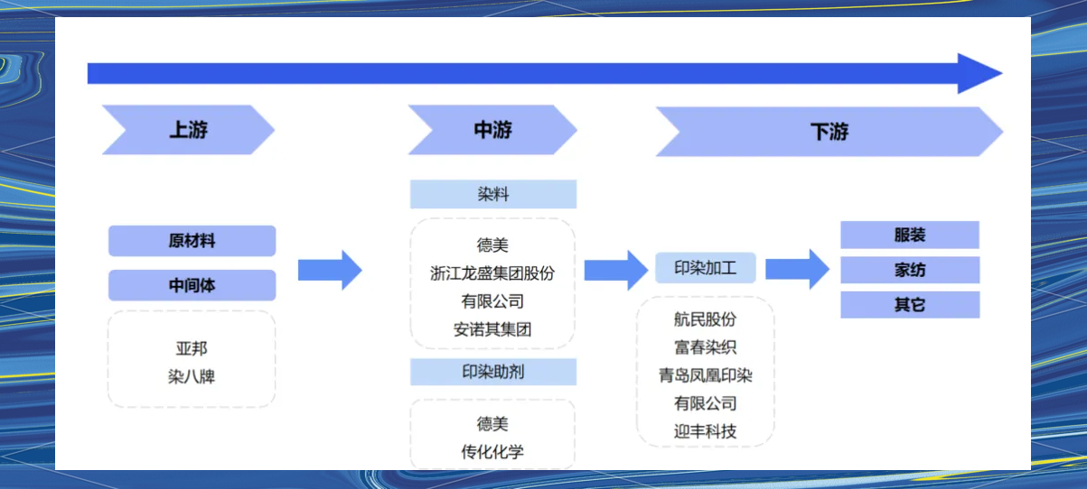 在农药产业链中,上游环节主要由原材料和中间体生产企业占据,他们提供各种化工原料。中游则是染料和印染助剂的生产制造企业,这些企业将上游提供的原料进行加工,生产出分散染料、活性染料等不同种类的染料。下游环节则是印染加工环节,这些企业将染料应用于纺织品的印染过程中,最终将印染好的纺织品提供给服装、家纺等企业。