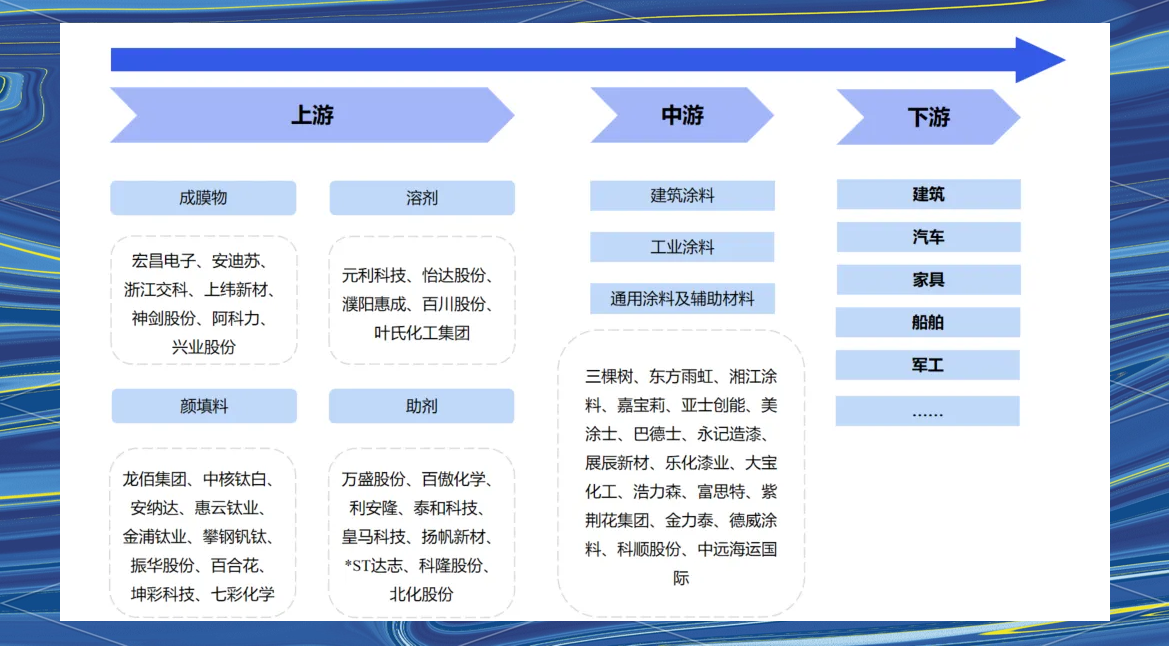 涂料产业链的上游聚焦于原材料市场,涵盖天然原料和化学原料,如甘蔗、维生素、柠檬酸和纯碱等。中游环节则是食品添加剂的生产供应,涉及防腐剂、抗氧化剂、甜味剂和香精香料等的制造。下游则是产品需求市场,主要应用于饮料、食品、调味品以及特殊营养食品的制造过程中。同时,饲料、医药、农业、烟草和日化等行业也广泛使用食品添加剂。在这个产业链中,金禾实业、星湖科技等企业扮演着重要角色。