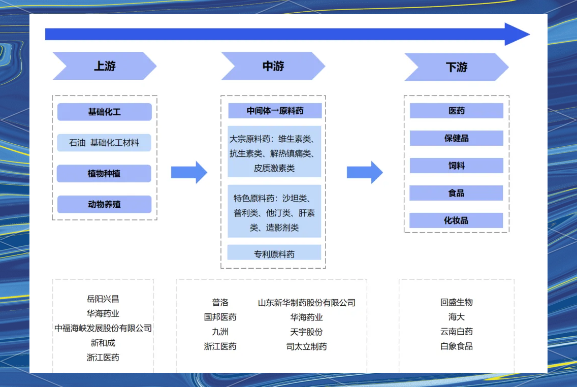 在染料颜料的产业链中,上游环节主要涉及原材料的获取,这涵盖了基础化工、植物种植以及动物养殖等多个领域。中游则是中间体或原料药的加工制造阶段,这一环节会产出诸如大宗原料药、特色原料药以及专利原料药等不同类型的产物。而下游应用市场则广泛涵盖医药、保健品、饲料、食品、化妆品等多个领域,这些领域都会用到染料颜料产业链中的产品。